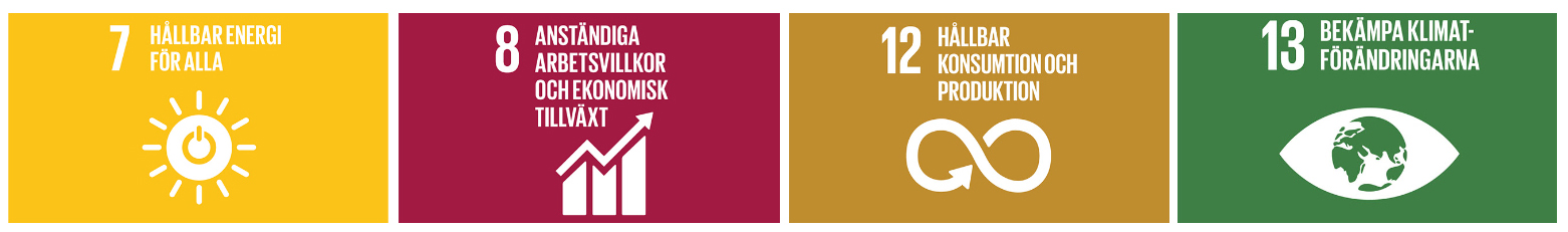 We are determined to actively and responsibly contribute to sustainable development and have a particularly strong focus on the UN’s global goals number 7, 8, 12 and 13. Within these goals, we continuously and carefully analyze the climate impact of our operations and work with concrete measures to to reduce our ecological footprint. We do this both through direct influence within our own operations and by encouraging our customers to make sustainable choices for our products and solutions.