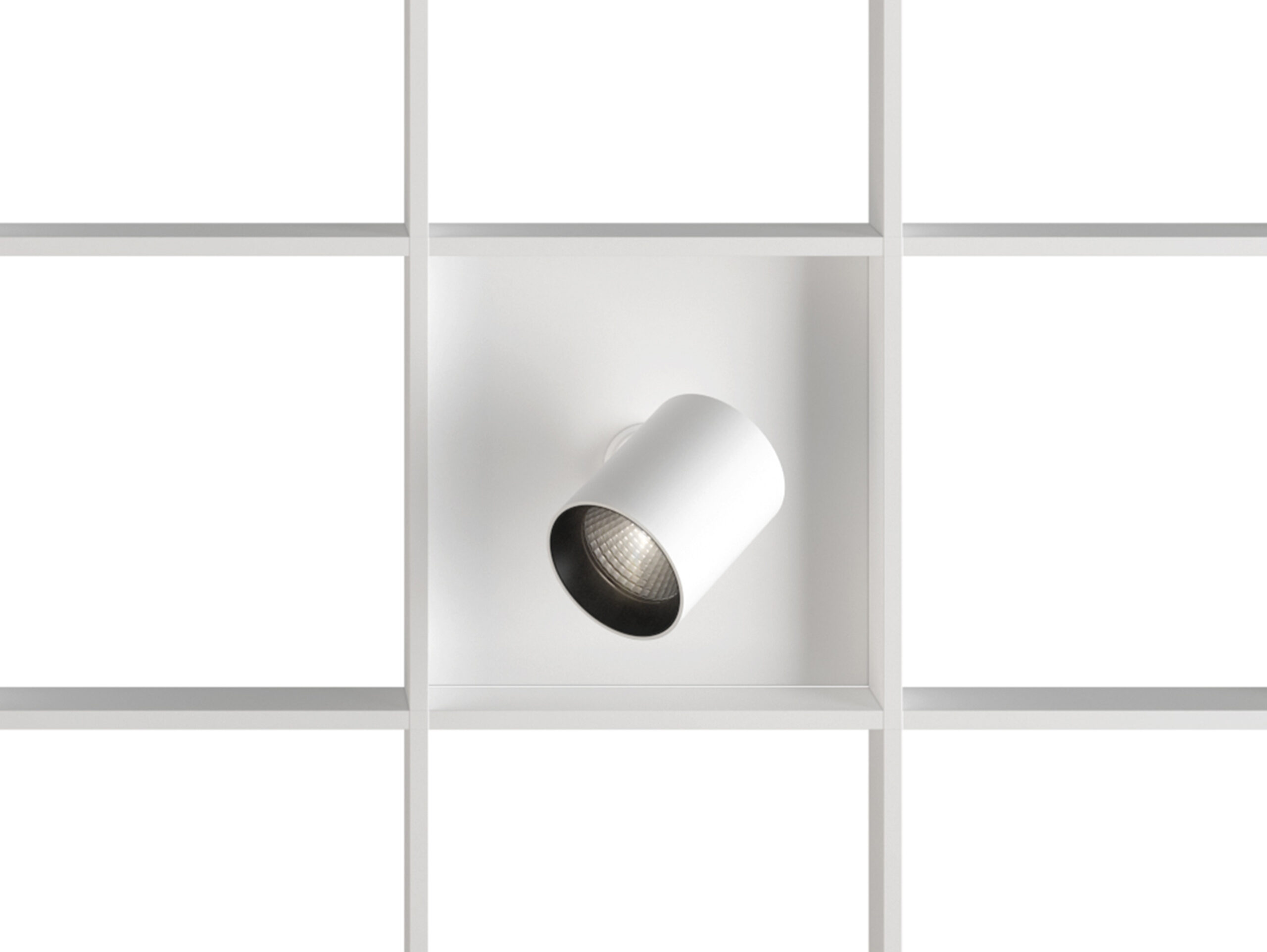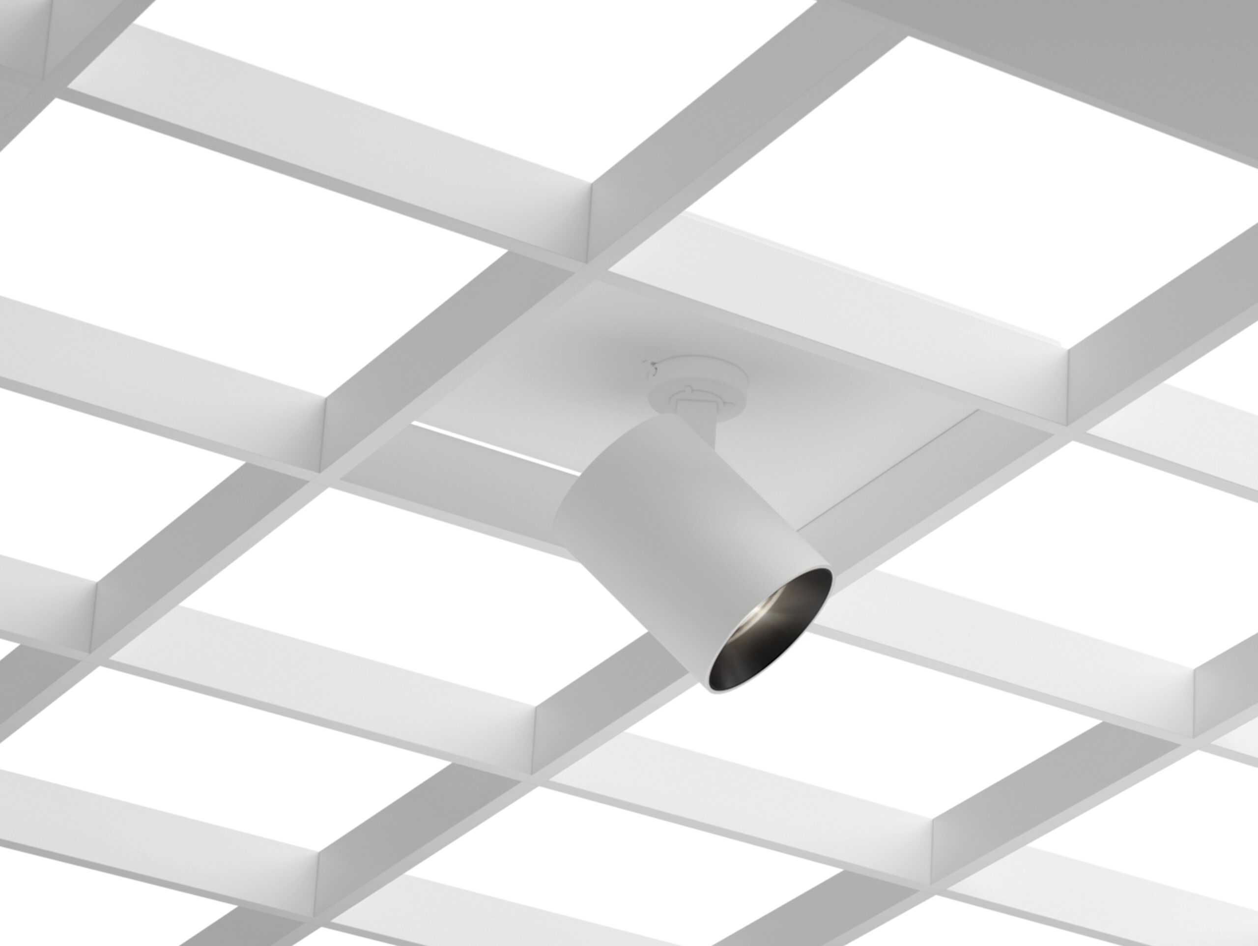 smartLED BOX downlight/spotlight för enkel och snabb montering på Caleidoscope openCELL rasterundertak. Finns med kassettstorlek för modul 250×250, 200×200, 150×150 samt 100×100 mm.