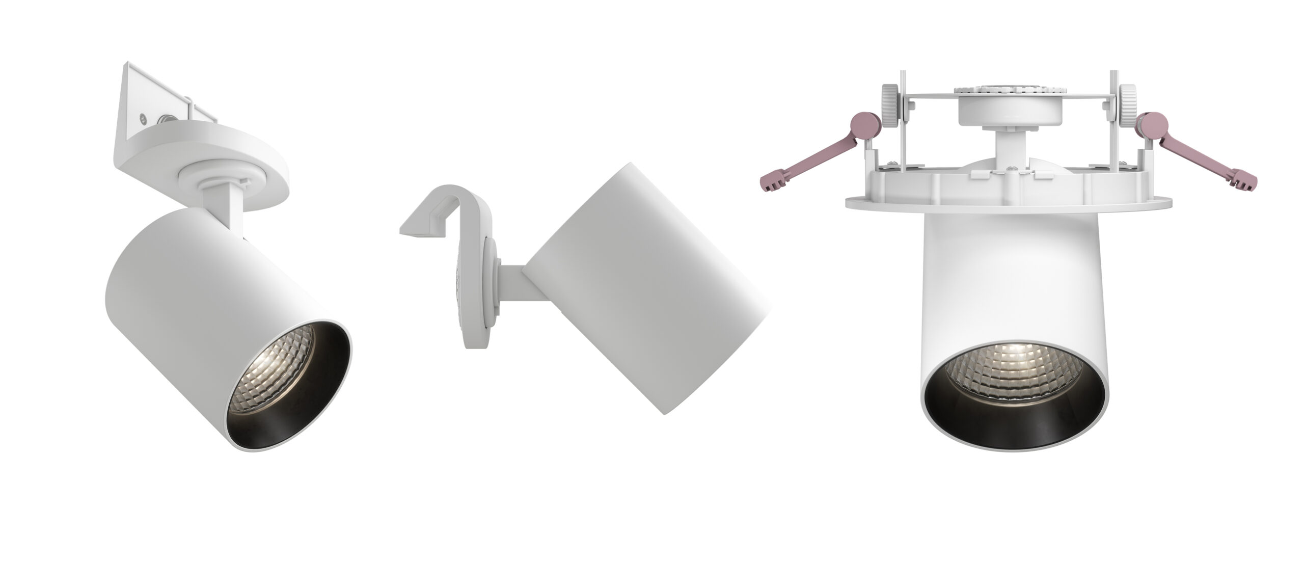 Patenterat spotlightsystem för multifunktionellt montage. Spotlight kan monteras till de flesta förekommande undertakstyperna när den används tillsammans med något av de olika infästningstillbehör.